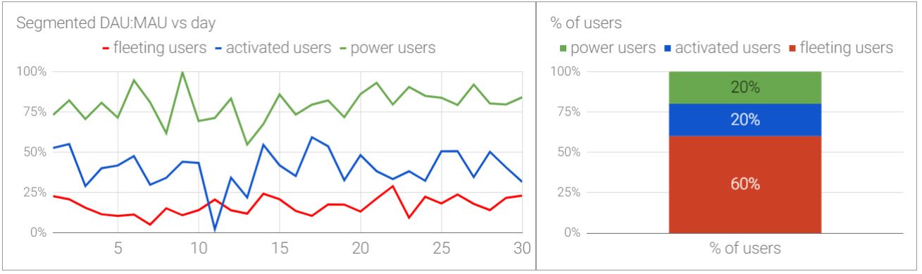 User behavior is similar to user growth, but instead of user types, you dig into user actions. Your goal is to show that only some pattern of user behavior is affected. For example, you may notice that along with average tweets per user, average comments per user and average likes per user are also declining, but overall sessions, visits, or time spent on an app don’t change. If that is the case, this is a larger issue you now have on hand which you would need to brainstorm about with different stakeholders and partners. It may lead to users “outgrowing” or “maturing” your product and might be suggesting that it’s time to rethink the product offering. The best way to represent user behavior change is a chart showing different user actions (tweets, likes, retweets, messages, etc.) compared to a time series of overall time spent on an app (apparently I like time-series charts). You have to show which user actions are declining and which don’t change.
