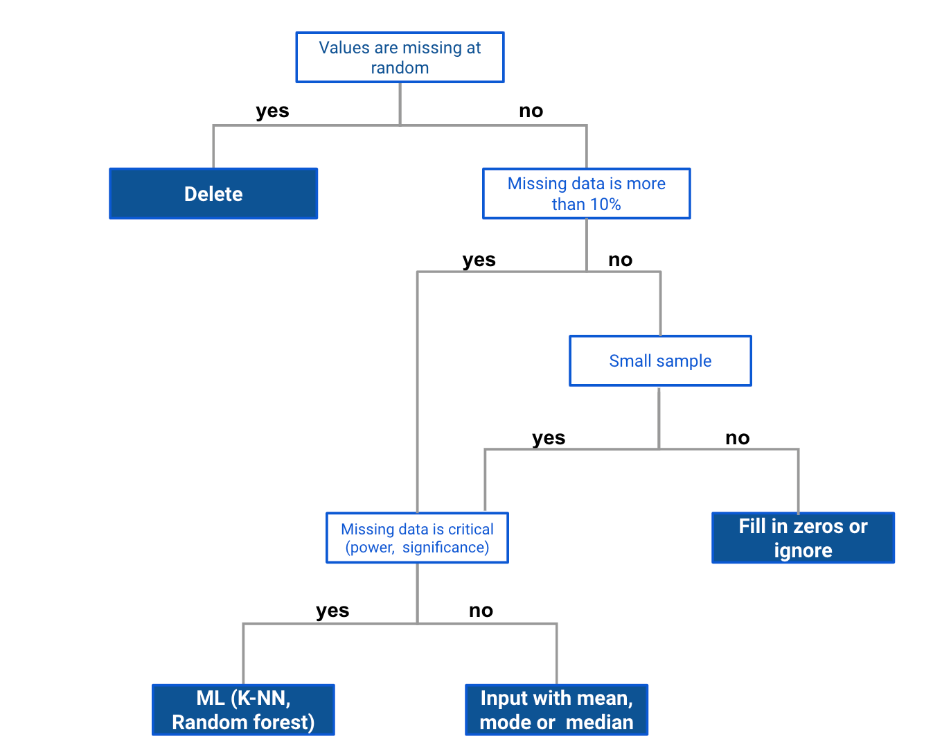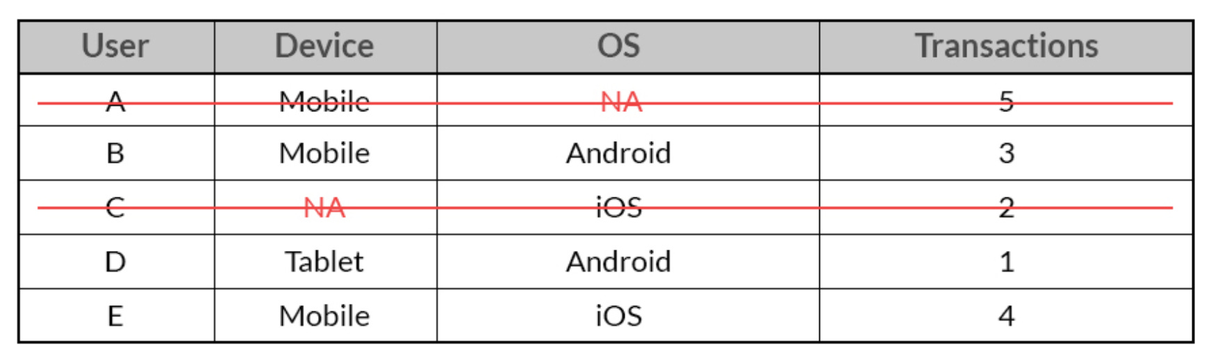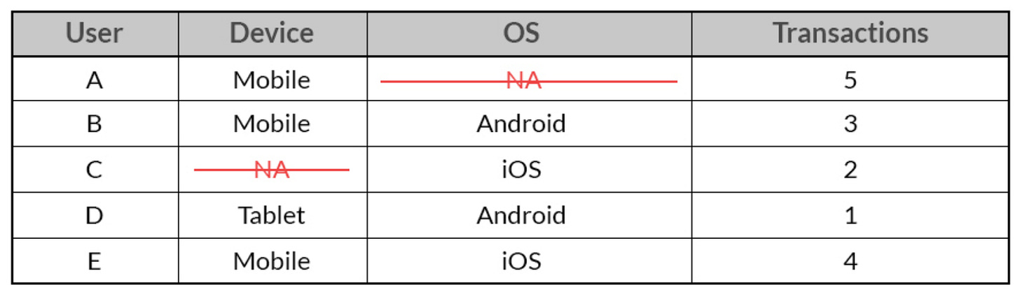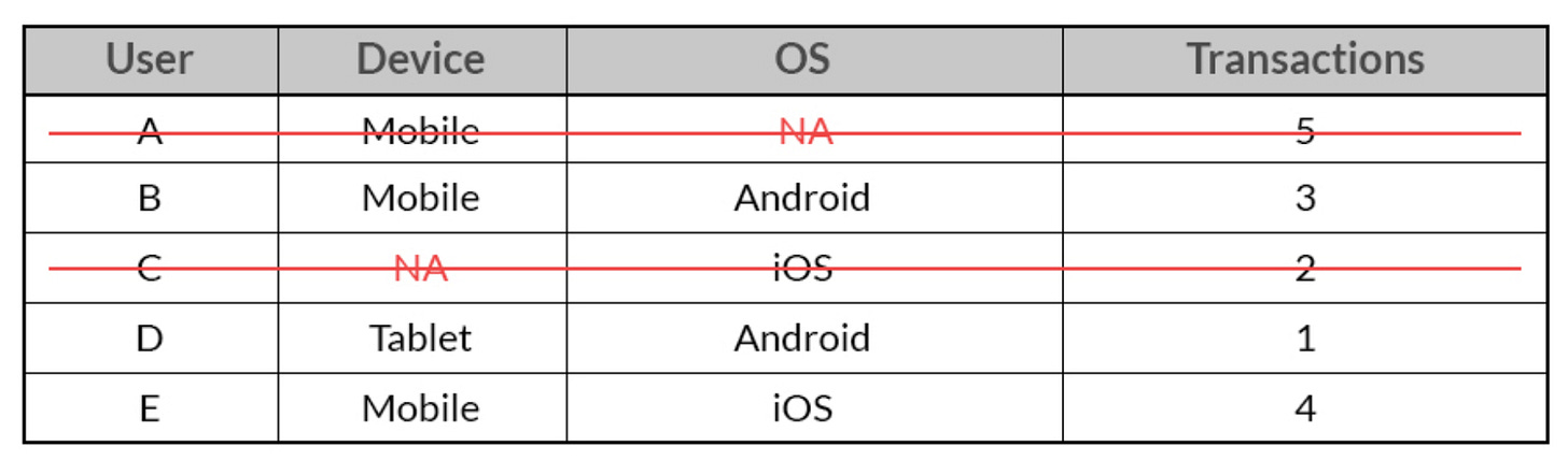 If your dataset is sparse or incomplete, you already know about 2 main ways to deal with missing values: you either ignore them or input averages instead of N/As and proceed like nothing bad had ever happened. You may also use more powerful methods, e.g forecasting the missing values or applying ML algorithms. In this issue, I want to offer more of a structured approach that will help you recognize situations where it’s okay to ignore N/As for your analysis or when you should do more thorough data cleaning.