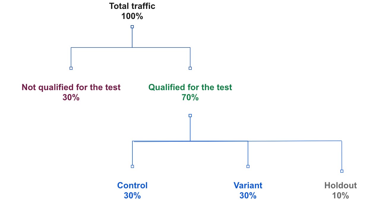 The treatment groups were set on a client side and split received random users into segments: Holdout, Control, Variant 1, Variant 2, and else. Control and Variants must be proportional. The holdout would contain users who are “qualified for the test” but were not selected yet to receive treatment (for example, if the rollout is set to 10% traffic only):
