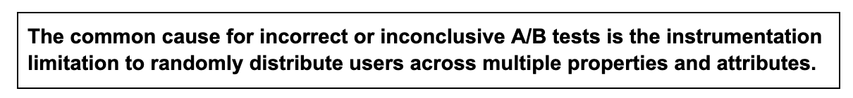 Our randomization feature was our “signature” product which we spent a lot of time productizing and testing. The common cause for incorrect or inconclusive A/B tests is the instrumentation limitation to randomly distribute users across multiple properties and attributes. It happens quite often and is very difficult to catch and prove. Teams that develop A/B testing in-house usually treat randomization as an add-on feature without giving much attention to it. What we did differently is that we approached randomization as a complete product itself - with its own development cycle, accuracy and precision scores, QA, and analysis.