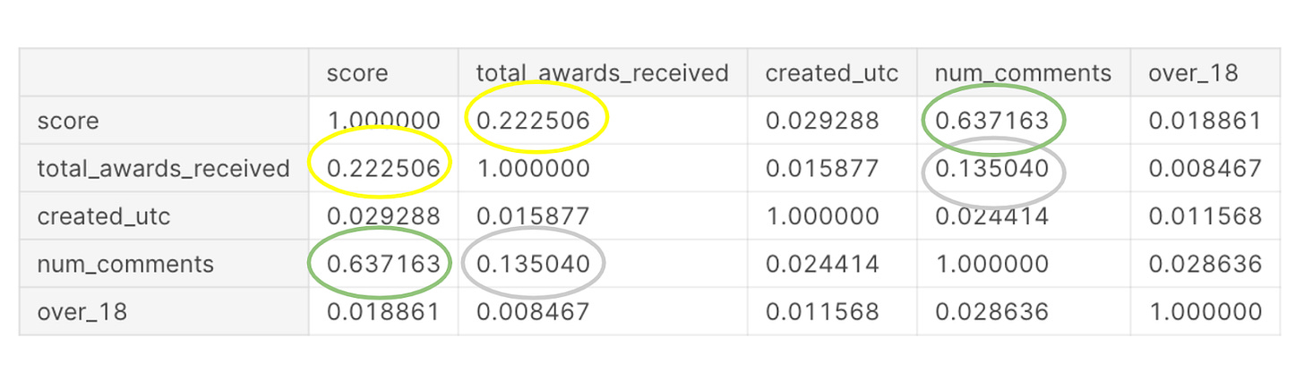DataFrame.corr() returns a correlation table between dataset variables. Here is an example of output from Reddit Exploratory Data Analysis in Python: