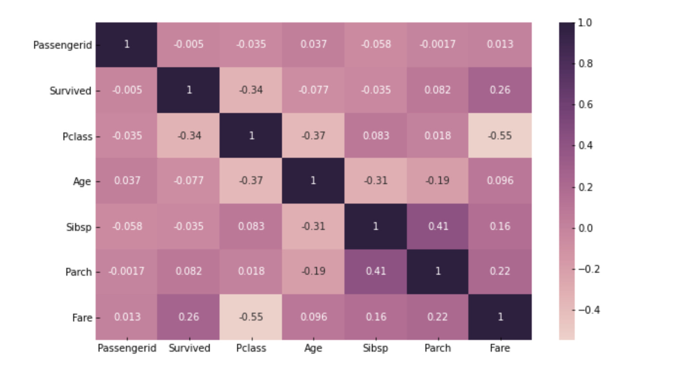 As you noticed, there are no high correlations in this graph. The highest value is 0.4 between parents/children and siblings. This relationship analysis guides us to the right input variables to create a ML model to predict passenger survival.