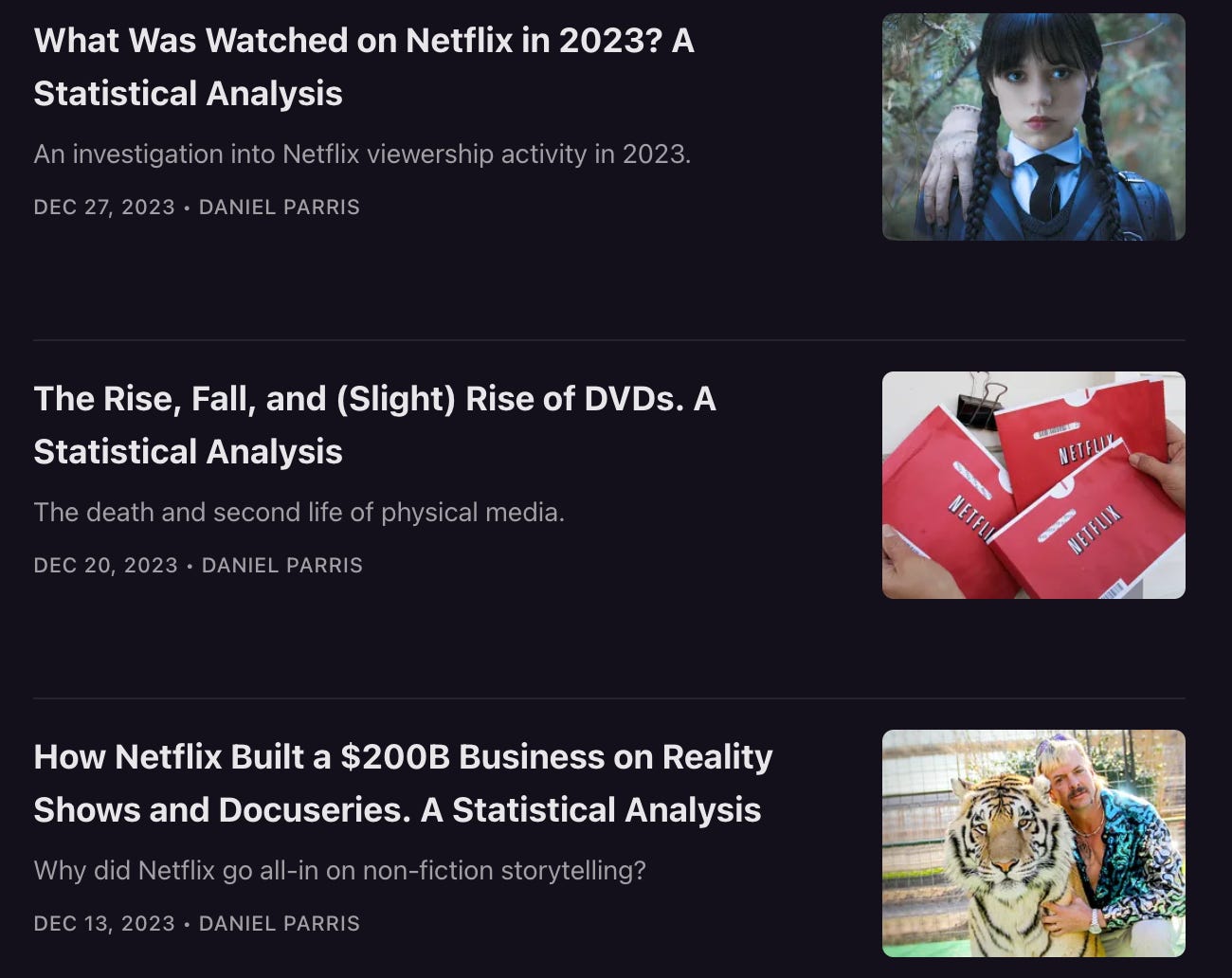 Daniel initially majored in film and started his career in the entertainment industry before transitioning into data science. Another reason I appreciate his newsletter is that he integrates his academic interests and passion for pop culture into his professional expertise as a data journalist, creating Stat Significant. That’s what makes it so good.