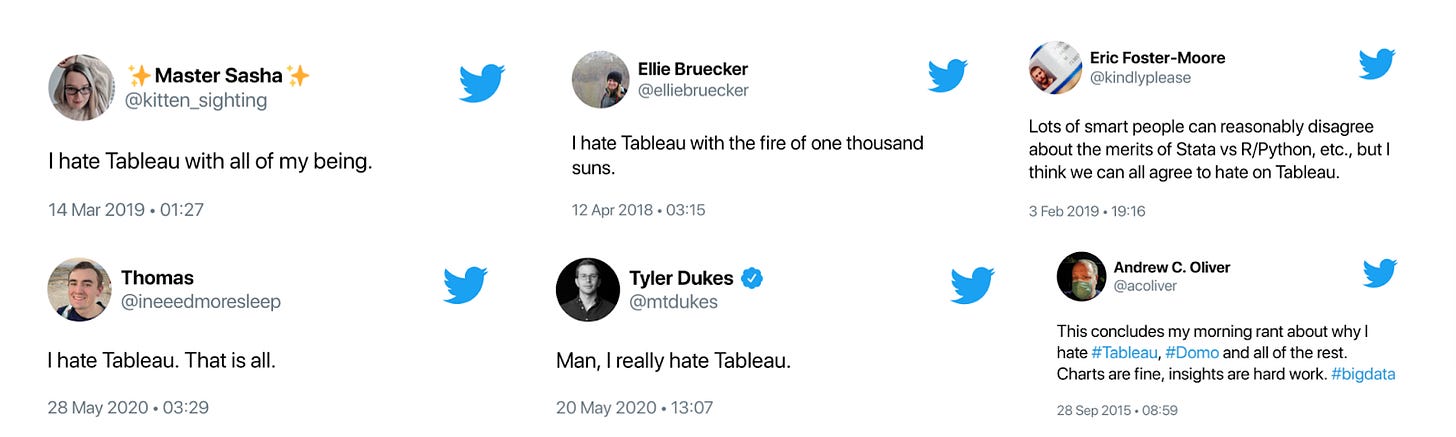 Today’s newsletter topic is a little sensitive, controversial, and a long-time pain of mine - Tableau. I was hesitant to write it at first, but if I’m up for a mission to develop analytics here, I can’t stay quiet. And hey, it’s my journal, so I write what I want!