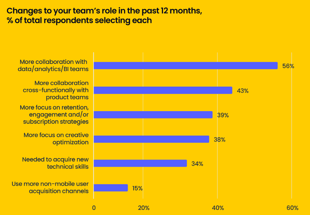 “We asked survey respondents how their teams have changed in the last twelve months. Unsurprisingly, over half of respondents cite working more with data, analytics, and BI teams. 34 percent also mentioned that they or their team needed to acquire new technical skills 43 percent reported more work with product teams.”