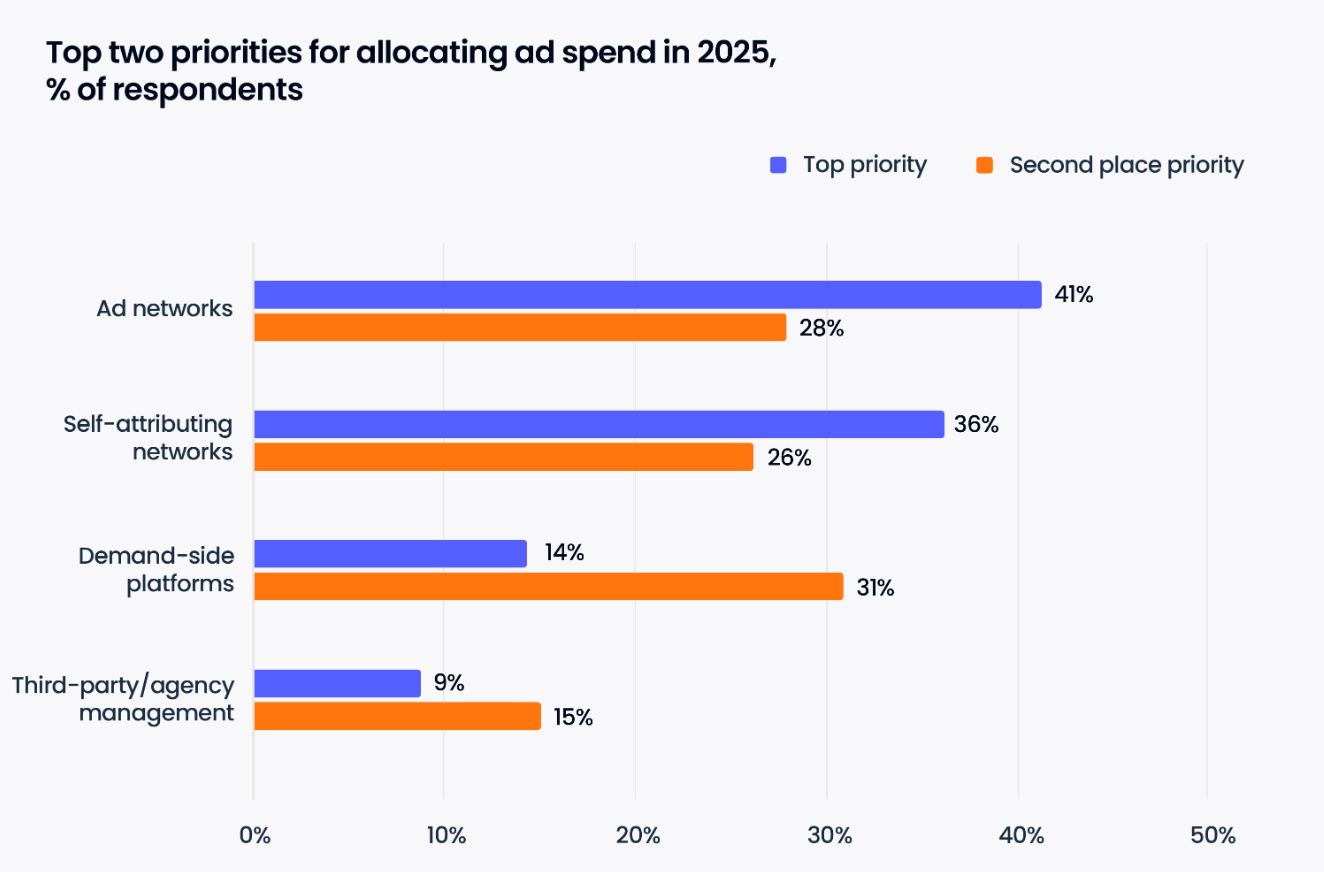 Ad networks or self-attributing networks remain top priorities for mobile user acquisition.