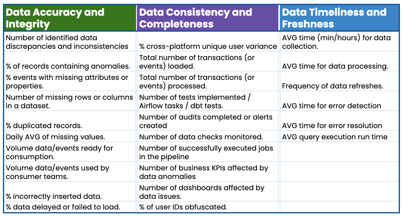 As entertaining as it might be, I want to make the framework for measurement simple and clear, so I decided to condense multiple data quality pillars into only 3 sections with the following KPIs: