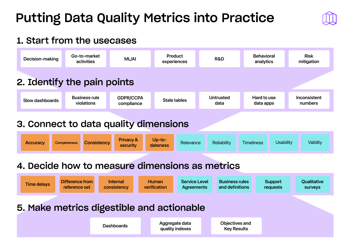 Monte Carlo’s Guide on 12 Data Quality Metrics That ACTUALLY Matter presents metrics such as the number of data incidents, time-to-detection, time-to-resolution, table uptime, importance score, table health, table coverage, custom monitors created, number of unused tables and dashboards, deteriorating queries, and status update rate.