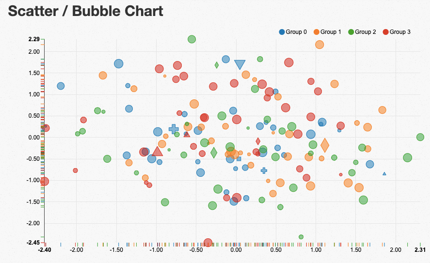 Relationship and Correlation visualizations can have two or more variables and the best representation would be done via scatter or bubble chart. You would use these to show clusters of data, outliers, or correlations.