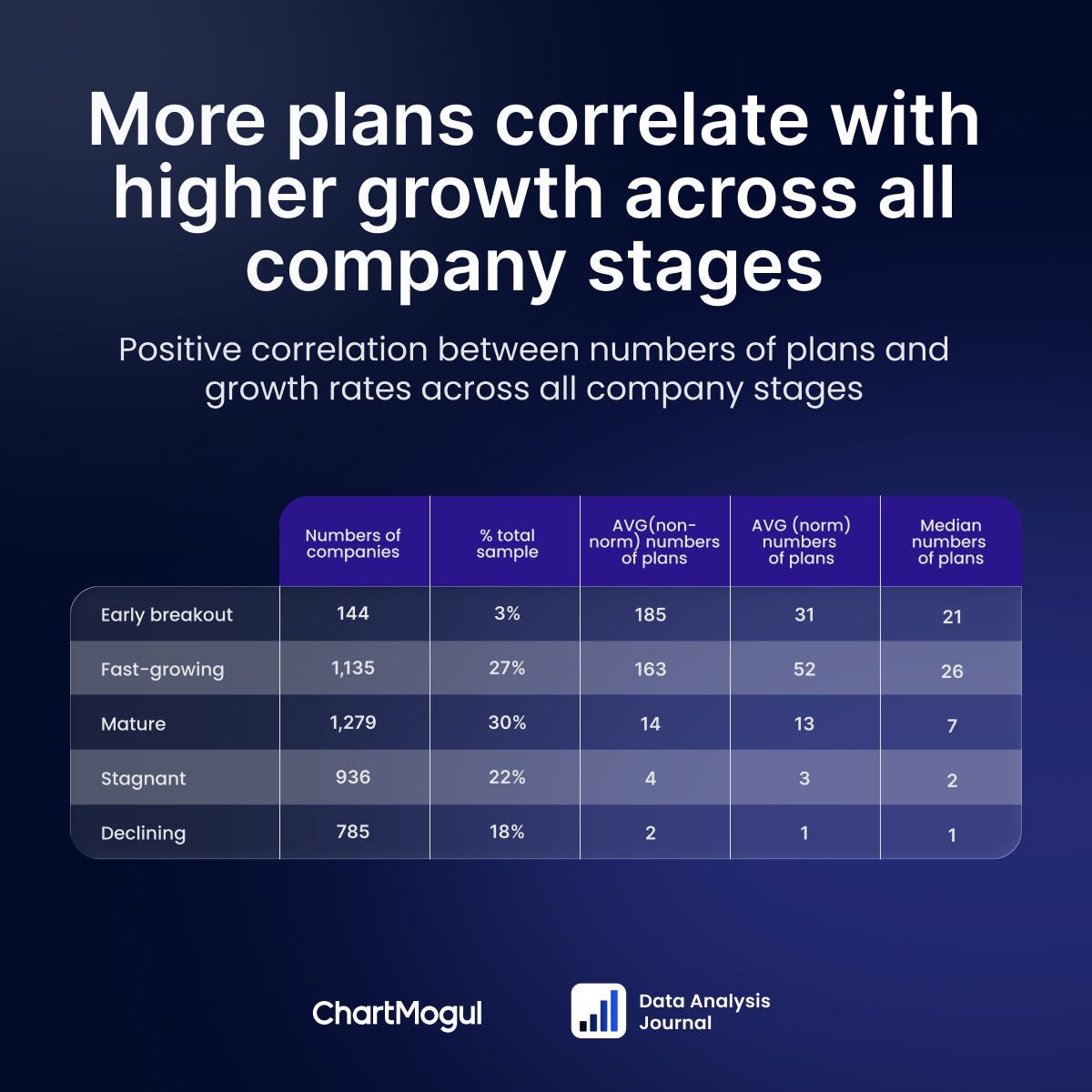 The takeaway is that growth is influenced not only by having a diverse set of plans early on, but also by continuously introducing new products and pricing options over time. So interesting how fast-growing companies tend to add significantly more plans (more than 10) than stagnant or declining companies.