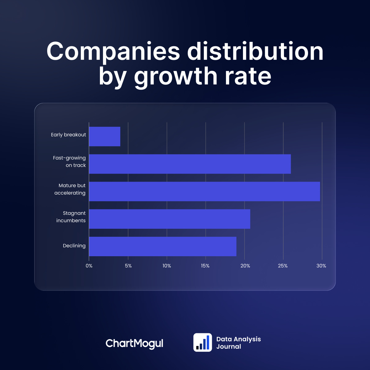 Growth is highly non-linear. Most companies cluster in slow-to-moderate growth, while breakout growth is rare. “Stagnant” is the most common failure mode.