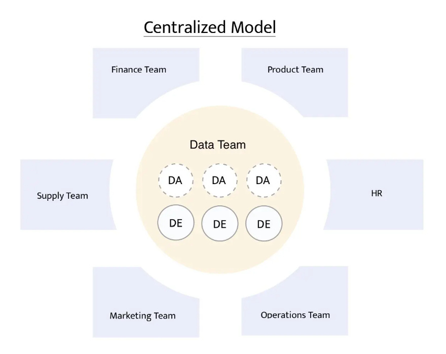 In the fully centralized model, a single analytics/data team owns everything: ingestion, transformation, modelling, analytics, and reporting. All analysts, data engineers, and data scientists sit in one department, and business units make requests to that team: