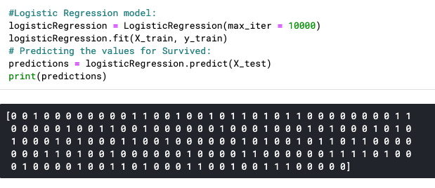 As we expected, the prediction returned a binary value 0 or 1 for every passenger in our set, which stands for 1 — Survived, 0 — Didn’t Survive.