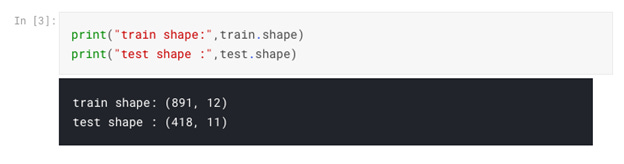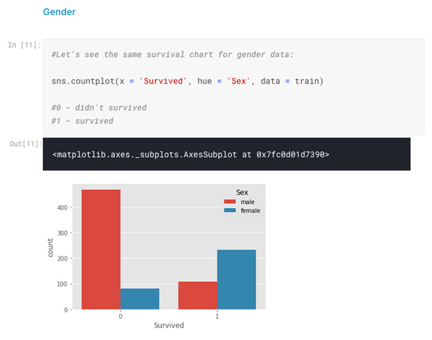 This tells us how big our datasets are, and we can see that the Train set has one more column. This is our target “Survived” value. Now, let’s take a look into gender data broken down by survival category: