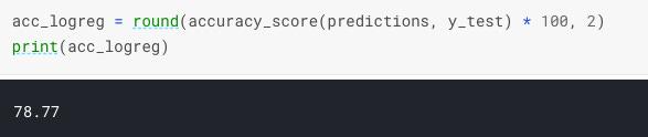 Not bad, having only a few features as an input, our prediction model has 78% accuracy. We can increase the accuracy score by doing more feature engineering to extract the most value from the input features.