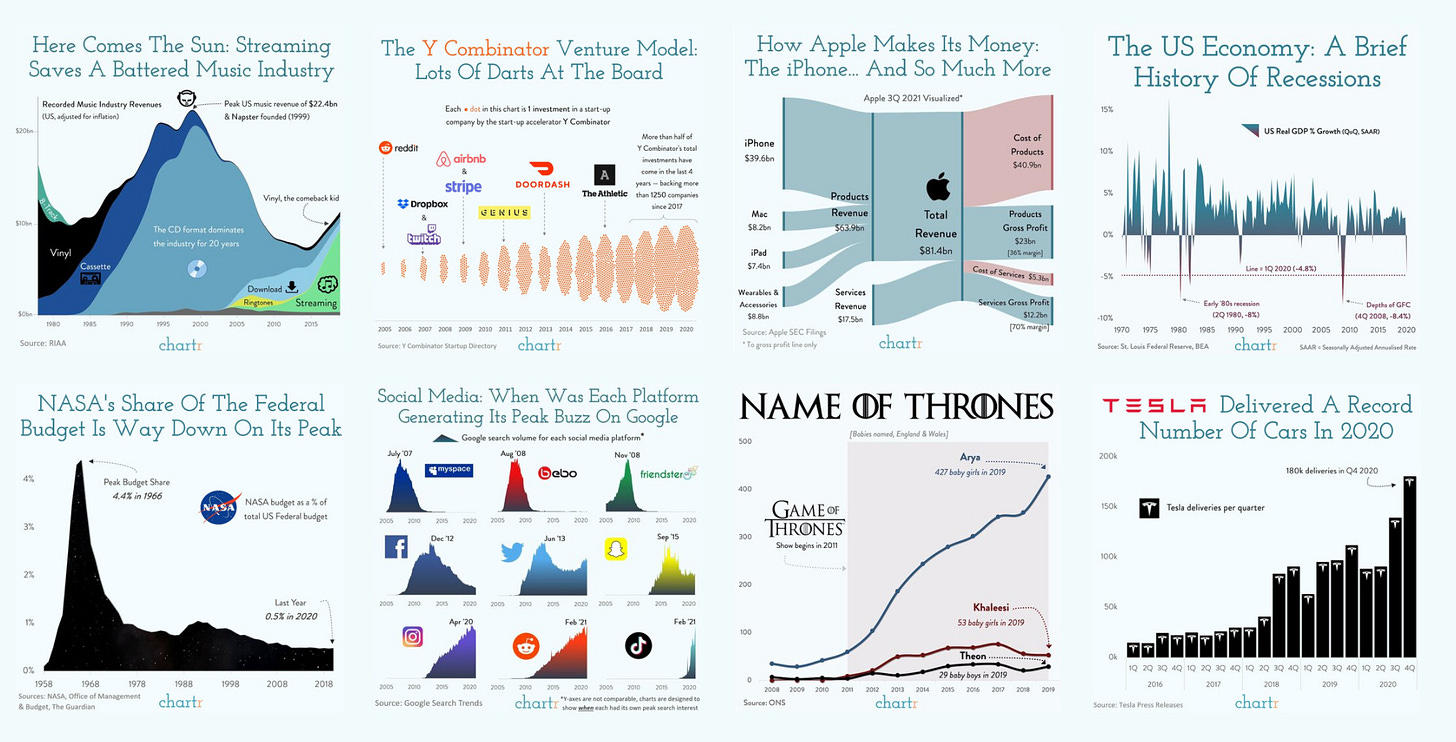 And, of course, my favorite newsletter of all time, Chartr is an ocean of data in one slide. They use best practices of data storytelling so simply and effectively. A newsletter to get inspired by. ❤️